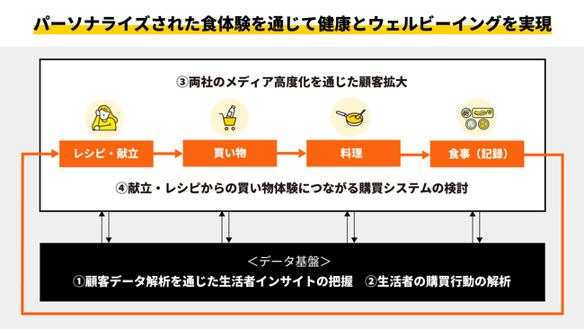 この度、これらの実現に向けて、エブリーが持つレシピ動画メディアを通じた生活者接点、食品スーパー向けのデジタルソリューションと、味の素グループの保有するおいしさ設計技術やアミノ酸研究を通じた健康と栄養に関する知見、生活者の洞察から得られた食のインサイトを生かして展開してきた同社のレシピや献立の提案サービス等を組み合わせることで、食と健康・栄養を軸としてパーソナライズされた新たな食体験サービスの構築を目指します。