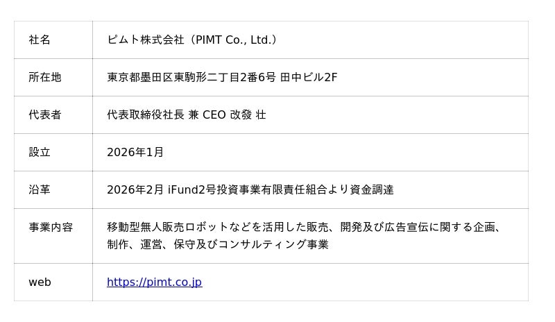 ピムト株式会社(本社:東京都墨田区、代表取締役社長 兼 CEO:改發 壮)は、移動型無人販売ロボット「PIMT-0(ピムト)」のサービスを開始したことをお知らせします。当社は、パナソニック ホールディングス株式会社における事業検証を経て、2026年1月に独立して創業しました。なお、パナソニック ホールディングス株式会社による資本参加はありません。最初の実用運用を4月6日より成田国際空港にて開始し、航空機の運航状況に伴う人流変化に合わせて販売場所をかえ、空港の魅力と収益性の向上に貢献していきます。なお、一元化された販売・販促・管理アプリを備えた遠隔操作型小型車の無人販売ロボットの継続的な実用運用は、国内でも珍しい取り組みです。