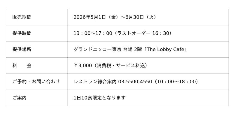 「東京を楽しむ 東京をくつろぐ」ひとときをお届けするグランドニッコー東京 台場(住所:東京都港区 総支配人:塚田 忠保)は、吹き抜けのロビーフロアに心地よい光が降り注ぐ「The Lobby Cafe」にて、選りすぐりのカカオが華やかに香る「至福のチョコレートパフェ ~カカオとフランボワーズの余韻~」を2026年5月1日(金)~6月30日(火)の期間に提供いたします。