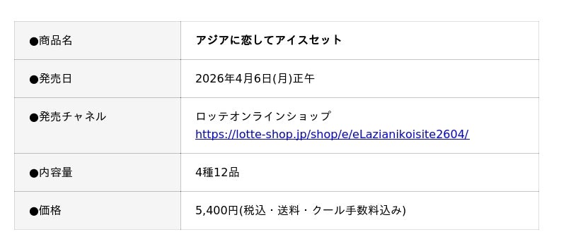 株式会社ロッテは4月6日(月)正午に、ロッテオンラインショップ限定で「アジアに恋してアイスセット」を販売します。爽やかで心地よい異国情緒あふれる味わいと香りが、解放的な気分にさせてくれるアジアンデザートアイス4品を揃えた、新商品を堪能できるセットです。ご購入いただいた方に、ここだけしか手に入らない「CUTIE STREET」の特典が付いてきます!1,000セットの数量限定販売となります。是非この機会に、アジアな世界観を表現した「アジアに恋して」をぜひお試しください。