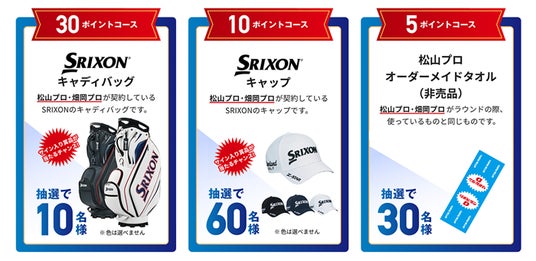 本企画は、リポビタンシリアルシールがついている全商品を対象に、シールのポイントを集めて応募いただくことで、30ポイントコースでは“SRIXON キャディバッグ”が10名様、10ポイントコースでは“SRIXON キャップ”が60名様、5ポイントコースでは“松山プロオーダーメイドタオル”が30名様、合計で100名様に豪華賞品が当たります。