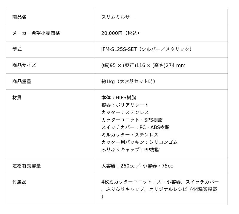 そこで、現代の住環境や幅広い世代の使い勝手に適応する「キッチンに出しっぱなしにできる一台」を目指し「スリムミルサー」を開発しました。ミルサーの高い粉砕力はそのままに、素材や設計を最適化することで、軽く小さく、手入れもしやすくなりました。