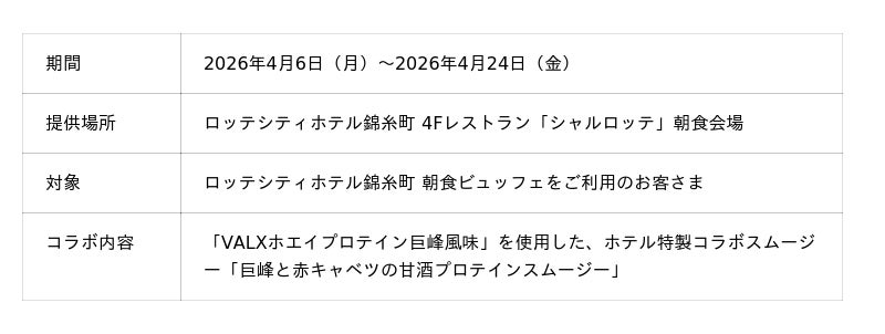 ロッテシティホテル錦?町(所在地:東京都墨田区錦?4-6-1 総支配人:福井朋也)は、フィットネスブランド「VALX(バルクス)」を展開するVALX株式会社(本社:東京都渋谷区、代表取締役:只石昌幸、以下VALX)とコラボレーションし、2026年4月6日(月)~2026年4月24日(金)の期間限定で、VALXの人気プロテインを取り入れた「巨峰と赤キャベツの甘酒プロテインスムージー」を朝食ビュッフェにてご提供いたします。