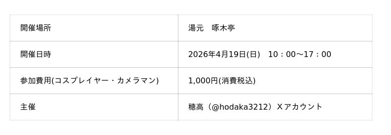 野口観光マネジメント株式会社 湯元 啄木亭(北海道函館市湯川町1-18-15/執行役員 総支配人 池田 恭太)では、2026年4月19日(日)に、コスプレイベント『啄コス』を開催いたします。