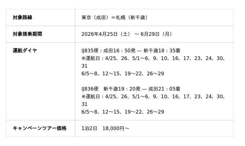 この度、多くのお客様にご好評いただいております「東京(成田)-札幌(新千歳)」線につきまして、好評につき、成田=新千歳線の運航期間延長が決定いたしました。桜色の優しい風や、爽やかな新緑の薫りに変わるベストシーズン!ゴールデンウィークや初夏の北海道や東京の旅行のご計画が、より柔軟にお立ていただけます。