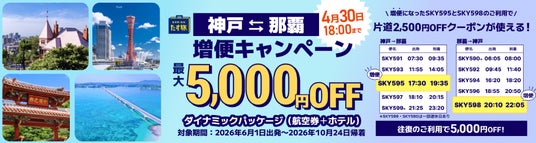 スカイパックツアーズ株式会社(本社:東京都中央区、社長:横山正巳)は、増便になった神戸⇔那覇線のSKY595便とSKY598便を利用するとダイナミックパッケージ『たす旅』がお得にお申し込みいただけるキャンペーンを実施します。