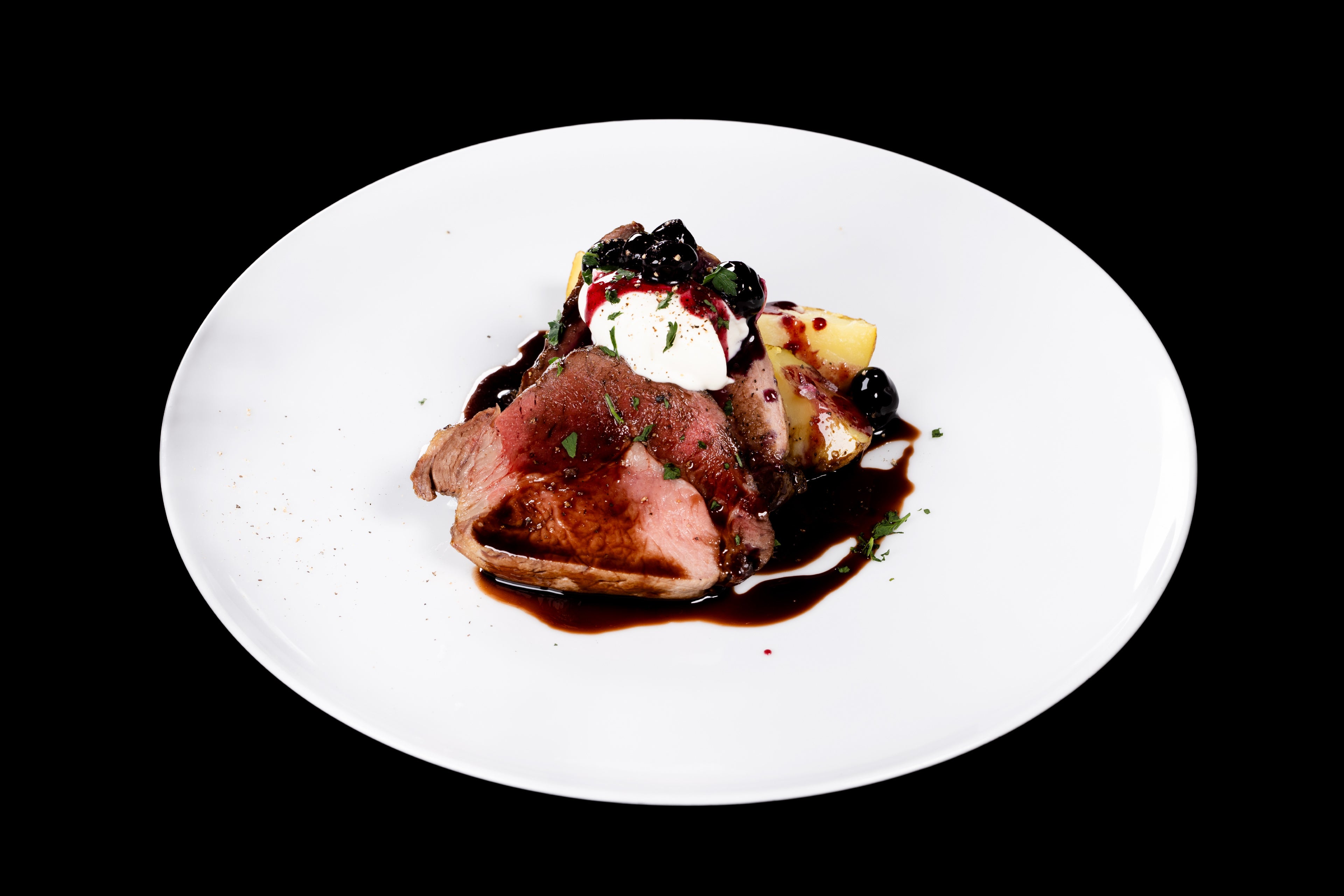 濃厚な赤ワインソースで仕上げ、サワークリームと旬のブルーベリーソースを添えました。