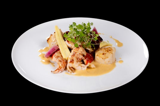 甲殻類との相性が抜群のカレーソースが、オマール海老とホタテにアジアンテイストを添えます。