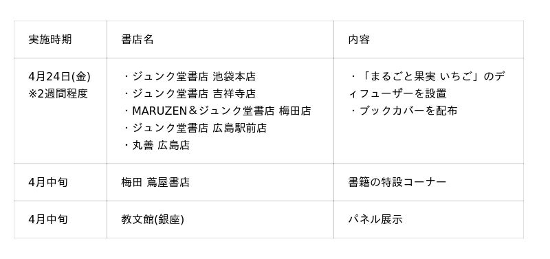 丸善ジュンク堂書店5店舗では、「まるごと果実 いちご」の香りがふんわり広がるディフューザーを設置するのとあわせて、同店舗で文庫本を購入の方に「まるごと果実 いちご」柄のオリジナルブックカバーをプレゼントします。