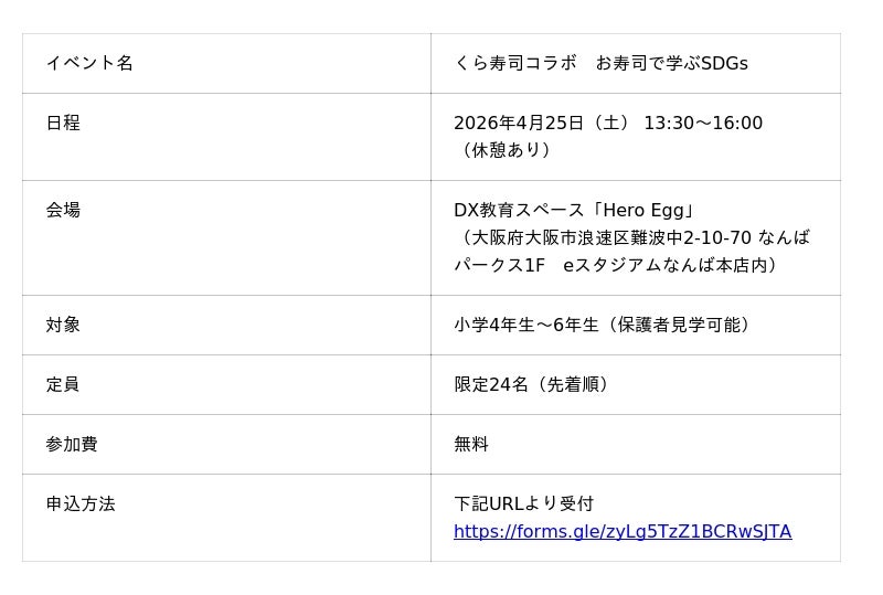 株式会社Meta Heroes(本社所在地:大阪府大阪市、代表取締役:松石和俊、以下「当社」)は、当社が運営するDX教育施設「Hero Egg(ヒーローエッグ)」において、回転寿司チェーン「くら寿司」を展開しているくら寿司株式会社(本社所在地:大阪府堺市、代表取締役社長:田中邦彦、以下「くら寿司」)とのコラボレーションによる体験型学習イベント「お寿司で学ぶSDGs」を2026年4月25日(土)に開催いたします。