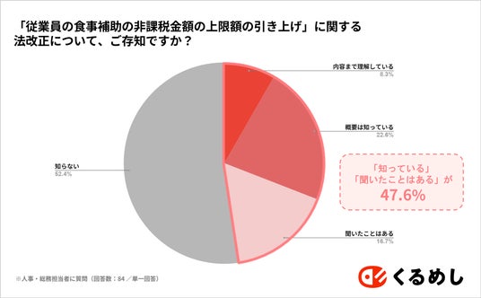従業員の福利厚生や「食事手配」をになうことが多い「人事・総務担当者」に回答をみると「内容まで理解している(8.3%)」「概要は知っている(22.6%)」「聞いたことはある(16.7%)」と、合計で47.6%の方が「理解している」もしくは、「聞いたことがある」状態であり、10%以上差がみられたものの、「人事・総務担当者」であっても、半数以上が法改正について、知らない現状であることがわかりました。