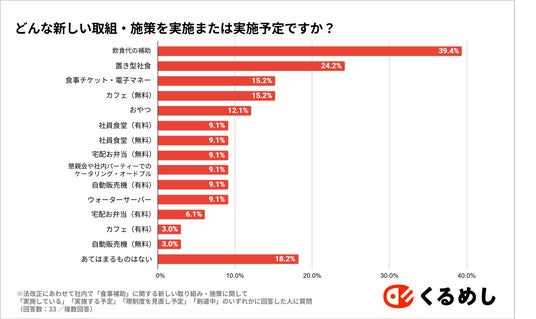 - 実施・見直し予定の取り組みは「飲食代補助(39.4%)」「置き型社食(24.2%)」「食事チケット(15.2%)」