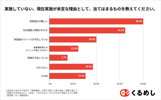 一方で、新しい取り組みや制度の見直しなどを実施していない企業に、実施していない理由を質問してみると、「制度設計が難しい」という回答が最も多く40%。ついで「社内調整に時間がかかる(32.3%)」「制度設計リソースが不足している(20%)」という回答が続きました。