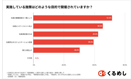 ● 施策の実施目的は「社員の健康経営の一環として(51.5%)」「社員エンゲージメント向上(45.5%)」