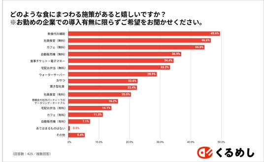 食にまつわる福利厚生について「あると嬉しい施策」を尋ねると、もっとも多い回答が「飲食代の補助(49.6%)」となり、次点で「無料の社員食堂(46.6%)」「カフェ(無料)」という結果でした。