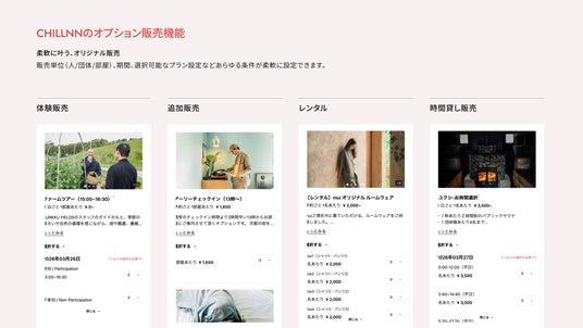 すでに自社サイトを保有しており、予約ページへの遷移による離脱を減らしたい施設制作会社にサイト運用を委託しており、既存サイトの構成を大きく変えずに直販を強化したい施設インバウンド対応を含め、自社サイト上で完結する予約体験を提供したい施設??「CHILLNN」について