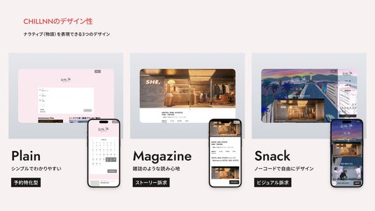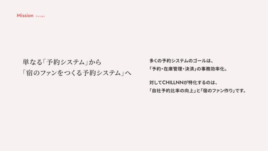 株式会社CHILLNNは、「ブランドを生み、育てる ただひとつの宿泊予約システム」をコンセプトに、宿泊施設向けの自社予約エンジン「CHILLNN(チルン)」を提供しています。