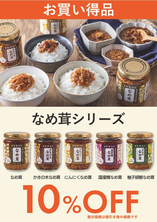 なめ茸シリーズが10%OFF!ご飯が進むなめ茸シリーズを、オープニング期間中【10%OFF】にて販売いたします。