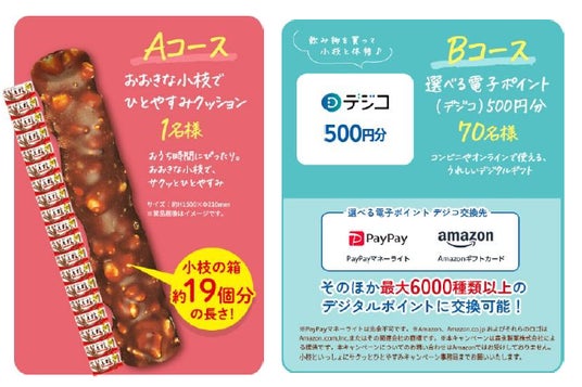 また、発売に合わせて、おおきな小枝でひとやすみクッション(1名様)や、選べる電子ポイント「デジコ」500円分(70名様)を小枝の購入者から抽選でプレゼントする「小枝といっしょにサクッとひとやすみ」キャンペーンを実施します。