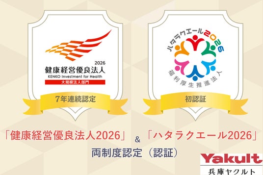 兵庫ヤクルト販売株式会社(本社:神戸市西区 代表取締役:阿部 恭大)は、7年連続となる「健康経営優良法人2026(大規模法人部門)」の認定に加え、本年度より、福利厚生の充実に取り組む法人を表彰・認証する「ハタラクエール2026 福利厚生推進法人」において初めて認証されました。