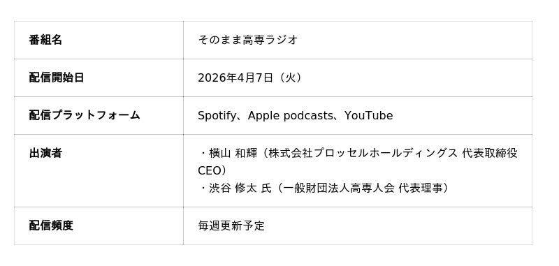 高専人が持つ技術力と実践力を結集し、人材・テクノロジー・ものづくりの領域で事業を展開する株式会社プロッセルホールディングス(本社:新潟県新潟市、代表取締役CEO:横山和輝)は、2026年4月7日よりSpotify等にて新番組「そのまま高専ラジオ」の配信を開始することをお知らせします。本番組では、長岡高専出身の起業家である横山和輝と渋谷修太氏がタッグを組み、「高専」をテーマにしたディープかつ刺激的なトークを展開します。