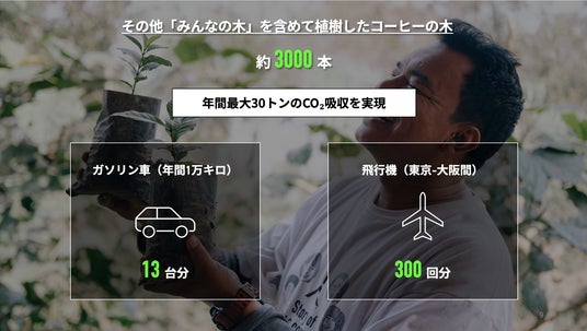 BIKAS COFFEEの植樹プロジェクトは、5年間で累計3,000本の植樹を行い、年間最大約30トンの二酸化炭素(CO2)の吸収の効果が見込まれています※1。このCO2吸収量は、ガソリン車で約10,000km走行する際の排出量に換算※2すると、およそ13台分、あるいは東京~大阪間の飛行機の片道移動に換算※3すると300回分に相当し、カーボンオフセット効果を大きく発揮しながら持続可能な農業と経済価値の両立を実現しています。