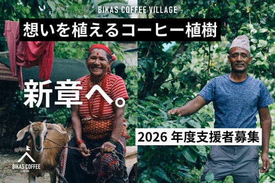 ネパールの山奥にアグロフォレストリーで育つ希少かつ上質なコーヒー豆を取り扱う合同会社BIKAS COFFEE(東京都文京区:代表社員 菅勇輝、以下:BIKAS COFFEE)は、コーヒーの苗に名前をつけて植樹するプロジェクト「BIKAS COFFEE VILLAGE」第6期のオーナー募集を2026年4月17日(金)より開始します。6期目を迎える今回は、新たに3つのプロジェクトを始動。これまで植樹してきたネパール・ハルパン村、ダリンボット村に加えて新たな村「ニルマールポカリ村」にて植樹を実施します。また、BIKAS COFFEEとして初となる精製プロセスへの挑戦や村人の暮らしに根ざした畜産プロジェクトを展開します。オーナー募集期間中は、全国各地で植樹プロジェクト参画企業とその地域の方々と共にイベントや出店を繰り広げ、国を超えて生産から消費まで、すべてのヒトの想いが重なり発展する社会を目指します。