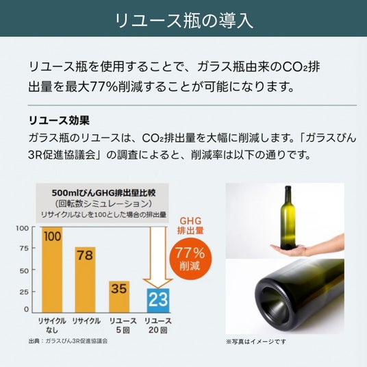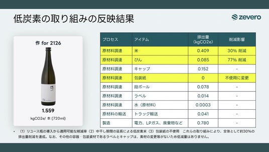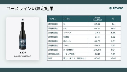 さらに、脱炭素測定の第三者機関「Zevero」による測定を行い、酒造り全体で排出される温室効果ガスをCO2換算で可視化。