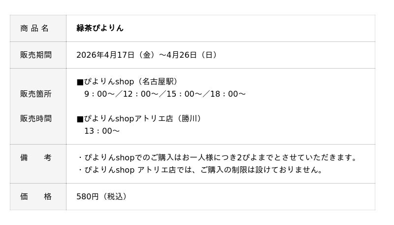 ジェイアール東海フードサービス株式会社(本社:愛知県名古屋市、代表取締役社長:岩下賢一)は、人気スイーツ「ぴよりん」の限定商品として、「緑茶ぴよりん」を2026年4月17日(金)から4月26日(日)までの期間限定で販売いたします。新緑の季節にぴったりの味わいと見た目をぎゅっと詰め込んだ、この時期だけのぴよりんです。ぜひこの機会にお楽しみください。
