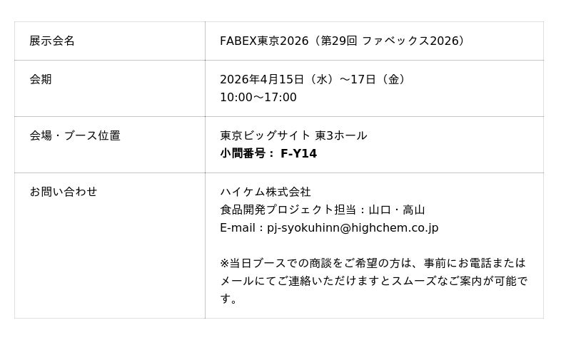 ハイケム株式会社(本社:東京都港区、代表取締役社長:高 裕一(たか ゆういち)、以下「ハイケム」)は、2026年4月15日(水)から17日(金)まで東京ビッグサイトで開催される「FABEX東京2026(第29回 ファベックス2026)」に出展いたします。
