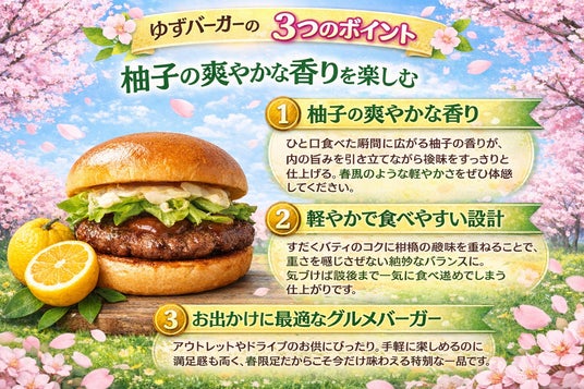 株式会社総合近江牛商社が運営する「近江牛バーガーSUDAKU(滋賀県蒲生郡竜王町)」は、春風香る季節に合わせた新商品「ゆずバーガー」「ゆずたまバーガー」を販売開始いたします。柚子の爽やかな香りで軽やかに仕上げた「ゆずバーガー(税込850円)」と、卵のコクを加えた満足感のある「ゆずたまバーガー(税込950円)」をご用意。アウトレットへのお出かけやドライブのお供にも最適なグルメバーガーとして、春限定の特別な味わいをぜひお楽しみください。