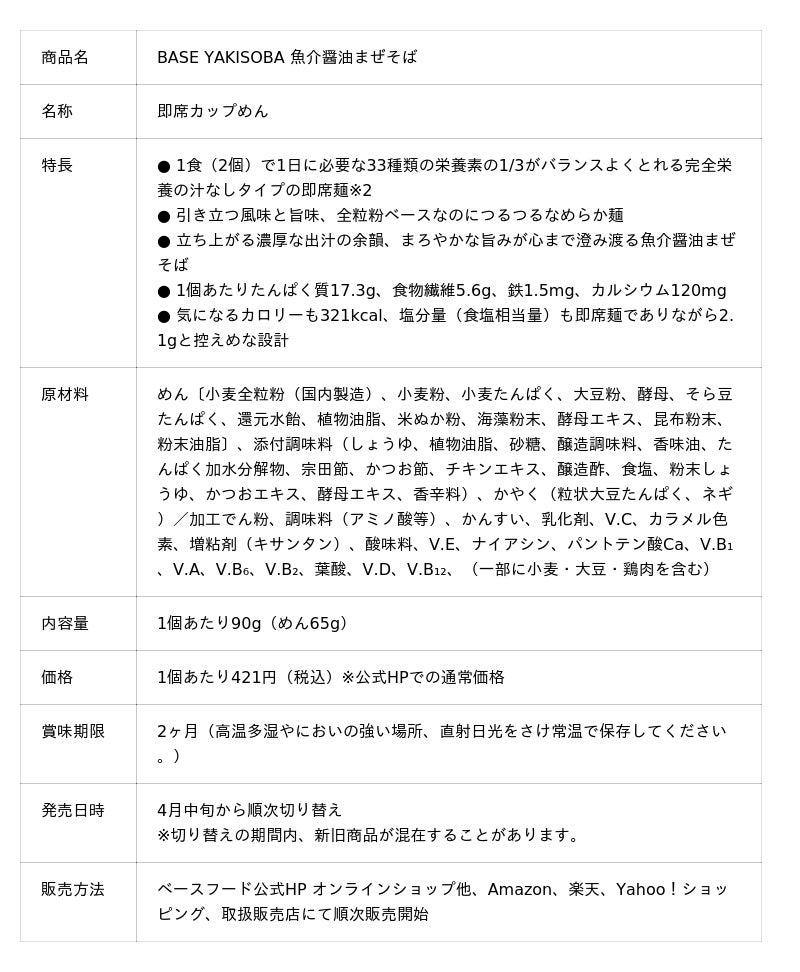 今回リニューアルする「BASE YAKISOBA」シリーズは、そのコンセプトはそのままに、より多くの方に、そしてより継続して食べていただけるよう“おいしさを追求”した「BASE YAKISOBA 3.0」。全粒粉ベースで栄養がバランスよく摂れ、さらにカロリーも塩分も控えめではありますが、今回のリニューアルによって、雑味や独特の風味をマスクされ、また味気なさを感じさせないような満足感のあるおいしさにアップデートしています。カップ麺は「健康に悪そう」「カロリーが気になる」「塩分量が多くて浮腫むのが嫌」と敬遠しているような方、そして「健康なカップ麺なんてどうせ不味いに決まってる」「ベースフードの味には抵抗がある」という方にも是非おすすめしたい商品です。
