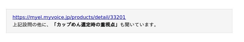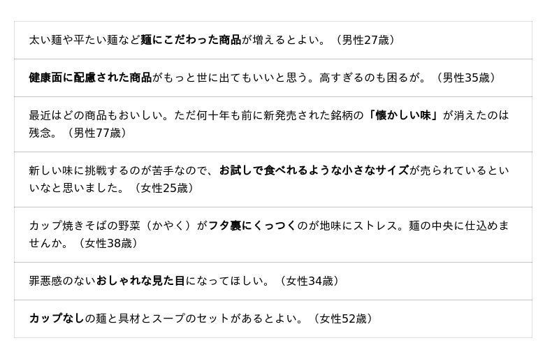 カップめんの喫食状況や意向、自由記述にてカップめんに期待することなどを聞いています。調査結果をお知らせいたします。