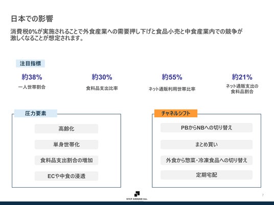 - 日本市場では、2020年時点で個人世帯の38.0%が単身世帯であり、2024年の単身世帯の月間消費支出は16万9,547円、そのうち食料は4万3,941円で25.9%を占める。高齢化、単身化、食費インフレ、EC浸透という構造要因により、食品減税の恩恵は、中食・食品小売・まとめ買いといったチャネルに流れやすい。