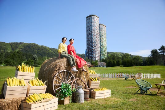 ファームエリアの入口付近に位置し、牧草ソファや牧草ロールが点在する牧場ラウンジ、そこが本イベントの会場です。とうきびを想起させる黄色と白を基調としたクッションやイスが置かれ、空間全体が「とうきびカラー」で彩られます。また、とうきびで装飾されたフォトスポットも登場。ここでは、牧草ロールにのぼって上からファームエリアを見渡したり、雄大な景色を背景に、写真を撮ったりすることができます。