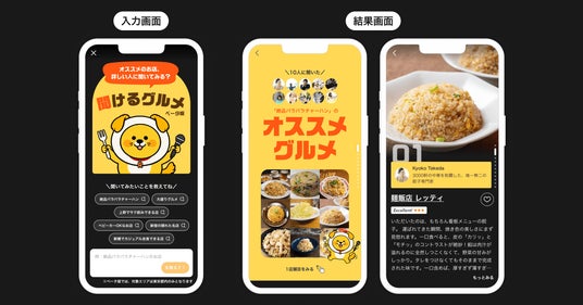 細かなこだわり条件を入力するだけで、ガイド役の犬のキャラクターがニーズに合うお店をダイレクトに提案します。現在はβ版として東京エリアのみで提供中です。