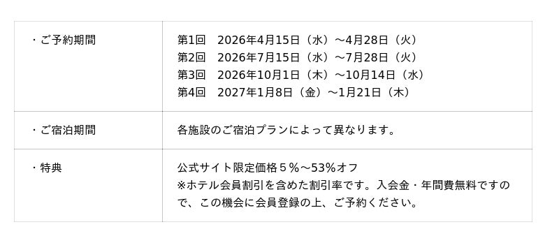 各施設の公式サイト限定で、通常よりもお得な特別価格の宿泊プランに加え、滞在をより充実させる特典をご用意しております。