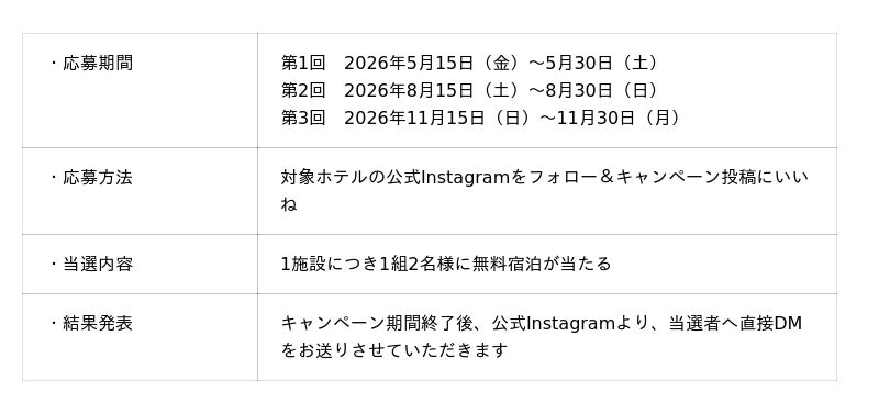 キャンペーン対象ホテルの公式Instagramをフォローし、対象投稿に「いいね」を行うことで、1施設につき1組2名様に無料宿泊が当たります。