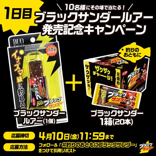 ブラックサンダールアーの販売開始を記念して、ブラックサンダーの公式Xにてブラックサンダールアー1個と、釣りのおともにぴったりなブラックサンダー1箱(20本入り)を毎日10名様(合計30名様)にその場で当たるキャンペーンを3日間開催いたします。■キャンペーン期間