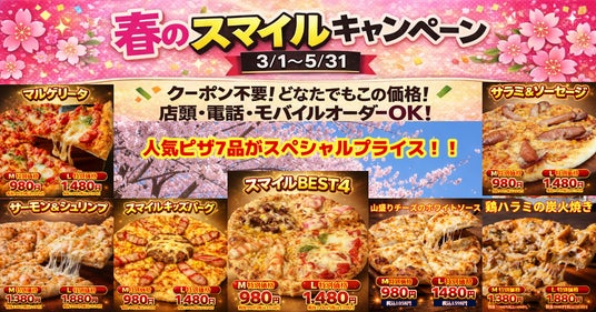 さらに、2026年3月1日から5月31日まで、春のスマイルキャンペーンを実施しています。クーポン不要で、店頭・電話・モバイルオーダーのいずれでも利用できる形で、人気ピザを特別価格で提供しています。