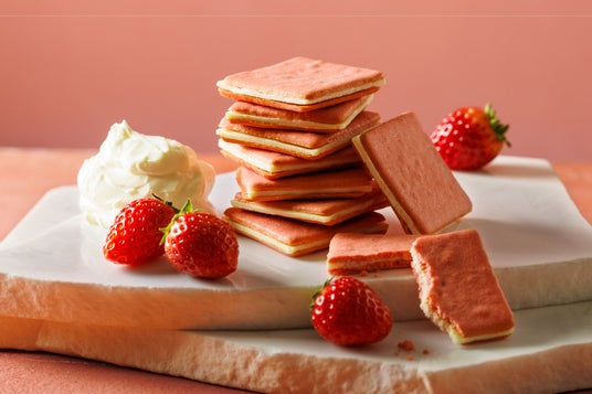 春を先取りした華やかなピンク色が目を引く、フルーティーなストロベリークッキー。ミルク感のあるやさしい甘さのマスカルポーネチーズ風味のチョコ※1をサンドして、サクサク食感に仕上げました。