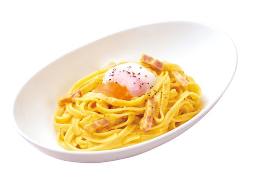 燻製パンチェッタと半熟卵をトッピングし、濃厚なソースが絡むよう生パスタのフェットチーネを使用しています。