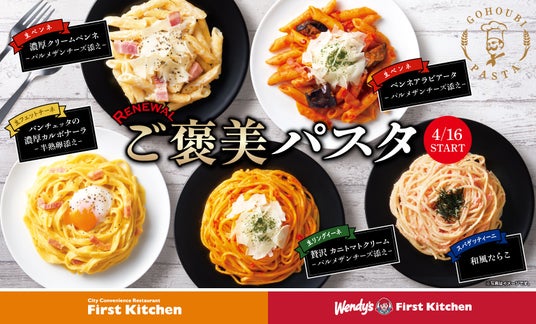 ウェンディーズ・ジャパン株式会社及び、ファーストキッチン株式会社 (所在地:東京都新宿区、代表取締役:紫関修) では、4月16日(木)から、ウェンディーズ・ファーストキッチンとファーストキッチン(一部店舗を除く※1)にて長らく販売しているパスタメニューを一新いたします。今回リニューアルする5つの新商品は、それぞれのソースにピッタリの麺をチョイスしており、濃厚なソースの旨味と本格的な味わいが楽しめます。今回の目玉商品でもある「贅沢 カニトマトクリーム」や「濃厚クリームペンネ」、「ペンネアラビアータ」には薄削りのパルメザンチーズをふんわりとトッピングし、チーズのコクと華やかさを添えました。また、とろ~り半熟卵をトッピングした「パンチェッタの濃厚カルボナーラ」や「和風たらこ」など、人気のメニューを取り揃えました。ファーストキッチンは本格的な生パスタ※2を手軽に楽しめるハンバーガーチェーンで、2005年にパスタの販売をスタートしてから21年、女性のお客様を中心に親しまれてきました。昨今、テイクアウトやデリバリー需要が高まる中、今回はさまざまな場面でもおいしくお召し上がりいただける商品へのリニューアルとして、当社従来品よりもテイクアウト品質にこだわったパスタも使用しています。テイクアウト時でも店内飲食のように美味しい商品を味わっていただければと考えております。ぜひ専門店のような本格パスタをファストフードチェーン店で手軽にお楽しみください。