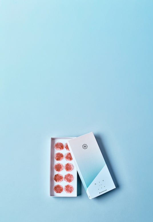 三つの食感が楽しめるアドベリー味の琥珀糖。琥珀糖の特長である外側のシャリっとした口当たりと中のとろみに加え、もちっとしたゼリーを閉じ込めています。七角形の多面体にすることで表面積を高め、より一層シャリっとした心地よい食感が特長。