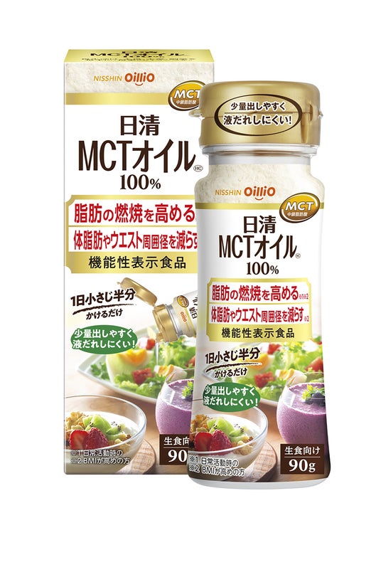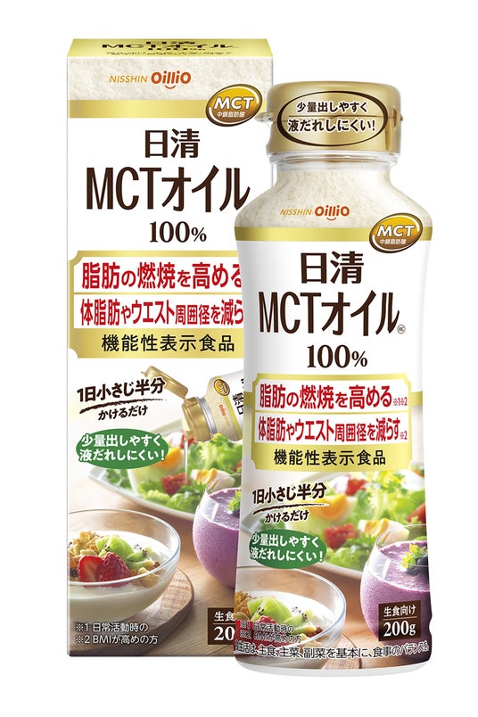 日清MCTオイルHCの主成分である中鎖脂肪酸は、BMIが高めの方の日常活動時の脂肪の燃焼を高めること、ウエスト周囲径の減少、体脂肪や内臓脂肪を減らすことが報告されています。いつもの料理に手軽にかけて、健康に関心の高い皆さまの理想のカラダづくりにお役立てください。