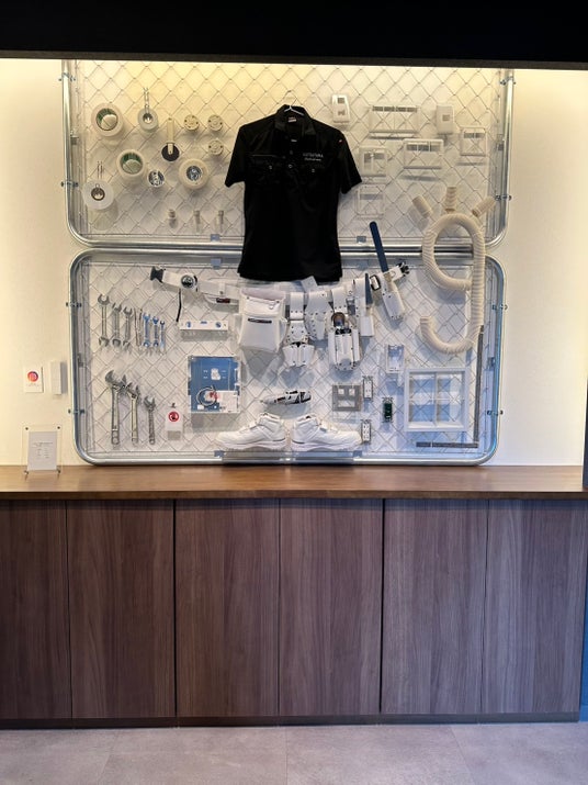 “電気工事屋さんのカフェ”として、壁面にあえて配管を施し、電設資材をディスプレイとして活用。普段は見ることのない電気工事の世界を、空間そのもので体感できる設計となっています。来店した瞬間から「電気工事って面白い」「かっこいい」と感じてもらえるよう、業界の魅力を直感的に伝える空間づくりを行っています。