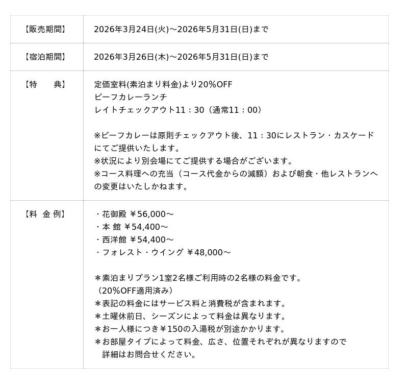 富士屋ホテルは、2020年7月15日に“平成の大改修”を経てリニューアルオープンし、2025年に5周年の節目を迎えました。このたびの記念にあわせ、箱根に芽吹く春の気配を感じていただける期間限定の宿泊プランをご用意いたしました。本プランでは、本館・西洋館・花御殿・フォレスト・ウイングの全客室を対象に、定価室料(素泊まり料金)より20%OFFにてご案内いたします。さらに特典として、富士屋ホテル伝統の味わいであるビーフカレーをお楽しみいただけます。
