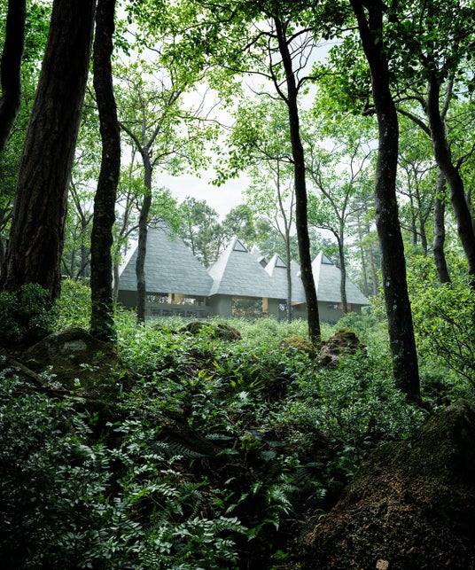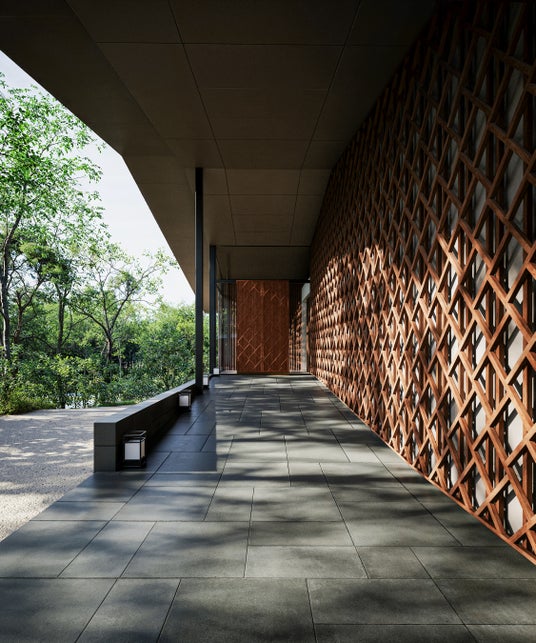 建築の空間には、日本文化に息づく「真・行・草」の思想が重なります。都市の緊張を帯びた「真」では、車寄せの低い軒や縦格子が都市的な感覚を残しながら迎えます。心身がほどける「行」では、回廊や客室棟に差し込む木漏れ日や影が、歩く身体にそっと触れて落ち着きをもたらします。そして森の空気と完全に響き合う「草」では、テラスやアウトドアダイニング、森の香りや光、屋根の連なりが視界に広がり、身体も心も森とひとつになる体験へと誘います。