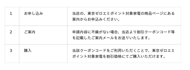 対象製品をご購入いただいた場合、東京ゼロエミポイントの申請手続きについては当店が代表して行いますので、お客様ご自身での煩雑な申請作業は不要となります。