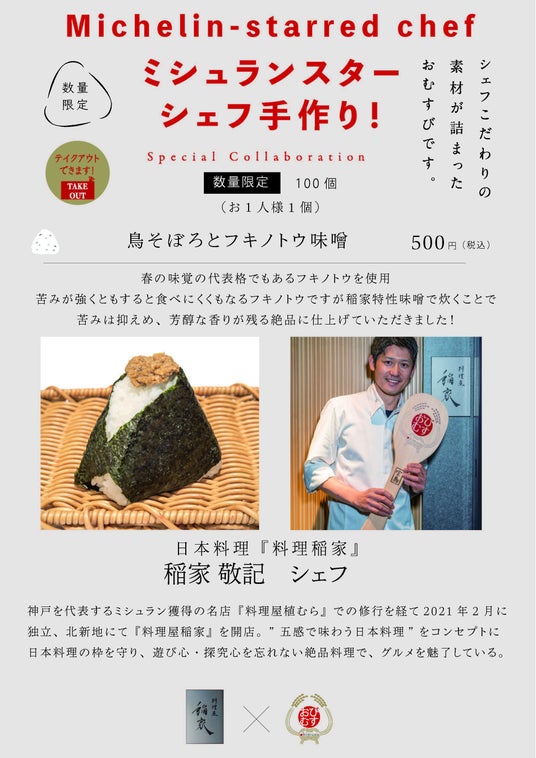 4月のミシュランコラボおむすびは『料理屋 稲家』(北新地) 稲家敬記シェフ作成の「鳥そぼろとフキノトウ味噌」おむすび